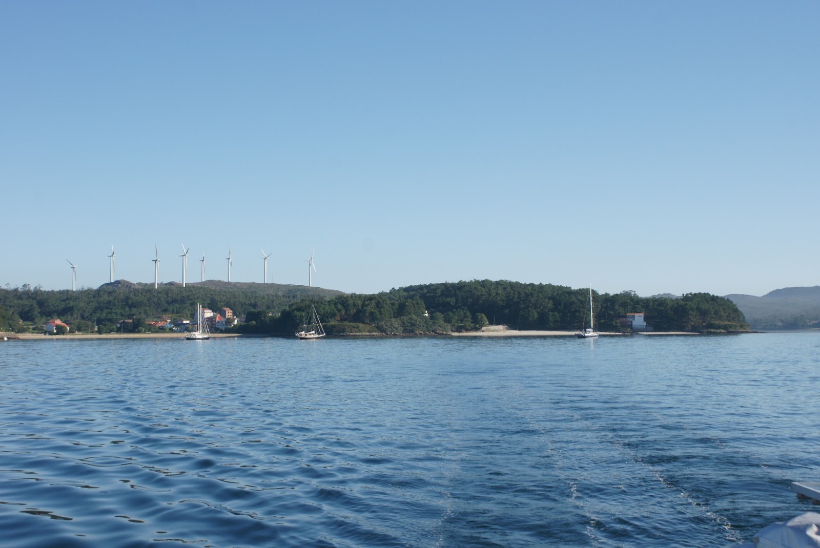 Fin bukt der vi lå til anker. Så tok vi nedover til Muros, da seilte vi forbi nordspanias kjente punkt Cap Finnisteer . I bukta ved Muros kom vi sikkert på spanks TV da et stort sykkelritt gikk rett ved oss og flere hellikoptere var der å filma. oss og sykklistene :)